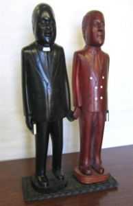 These are the unusual figures carved by 22-year-old Prince Mossebo, an artist residing in Bokonzo in northwestern Congo. They depict the heads of both the Congo and the American Covenant churches, Mossai Sanguma and Glenn Palmberg, to commemorate Palmberg’s visit to Congo in 2003. Mossebo also designed this year;s Christmas ornament, which inspired the design for the 2006 Congo Christmas card.