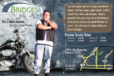 Andrews is the chapter historian for his local Harley Davidson motorcycle club. A postcard announcing the new church has a picture of a motorcycle rider with the words, “Where is the road taking you?” The back includes a picture of Andrews wearing his leather vest standing next to his motorcycle. The invitation lets potential visitors know, “There will always be a place to hang your helmet at Bridges.”